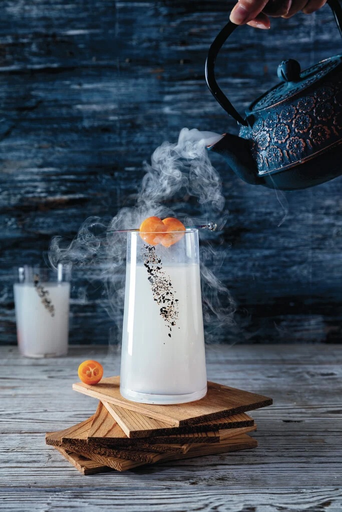 Among the most universal of the hot alcoholic drinks, the Hot Toddy originated around 1862 and featured a simple recipe of brandy, white sugar, and hot water—a mixture that has been reimagined time and time again through the decades. Below is an Asian-inspired iteration using an unfiltered sake, with a creamy white finish and a burst of citrus flavor from the yuzu and kumquat.